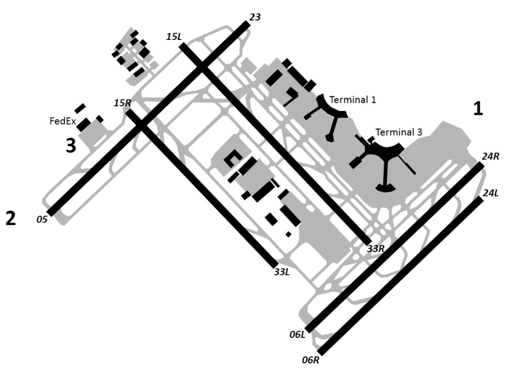 - Runways: The airport has 5 runways, arranged in both parallel and intersecting configurations.
