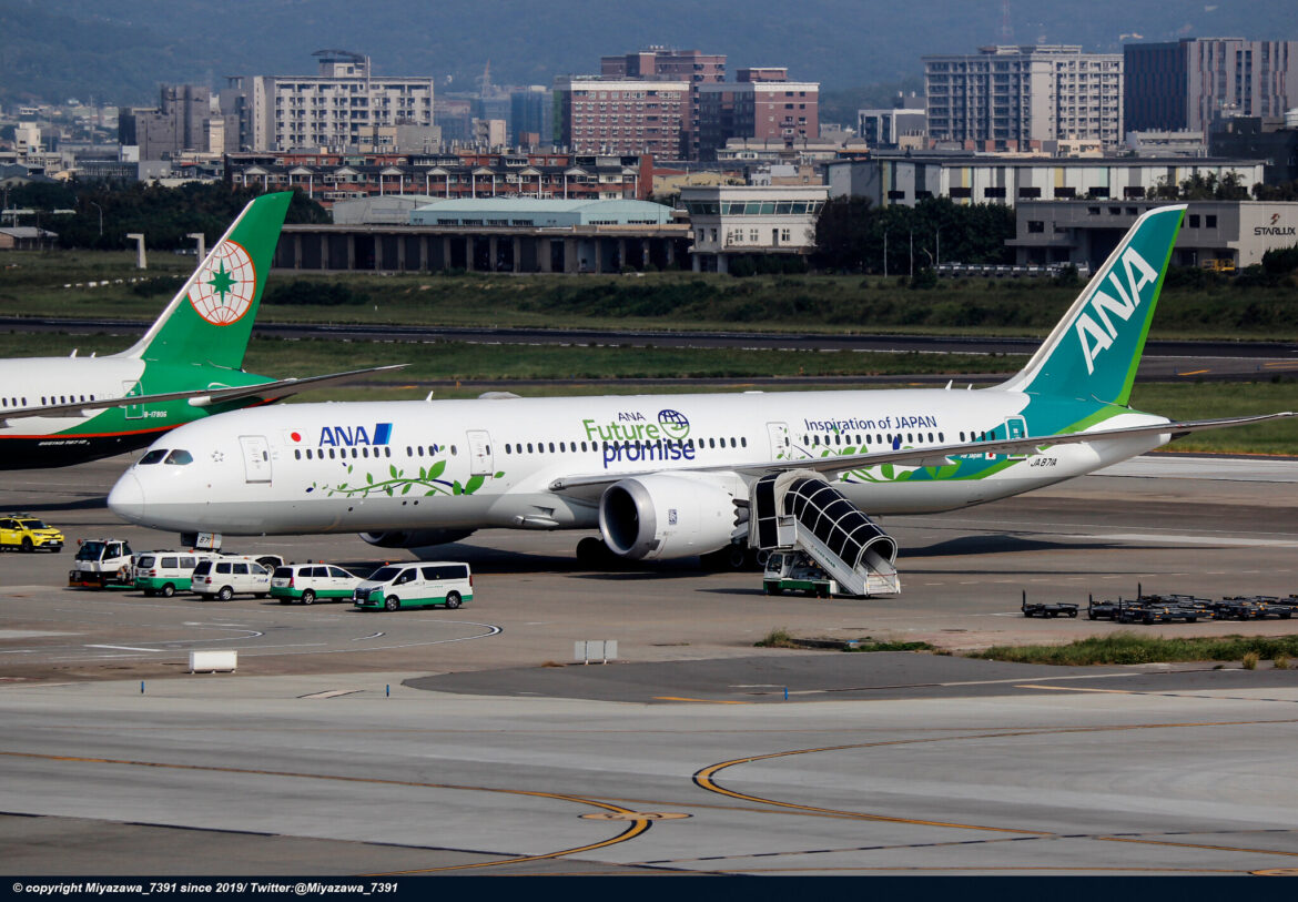 All Nippon Airways (ANA) has painted Boeing 787-9 JA871A in this green ‘Future Promise’ livery. ANA Group has set a medium-to-longterm environmental goal of achieving zero CO2 emissions from aircraft operations by 2050.