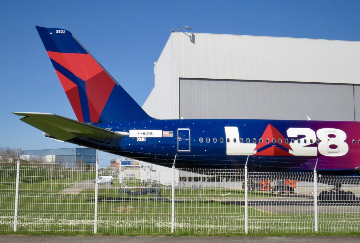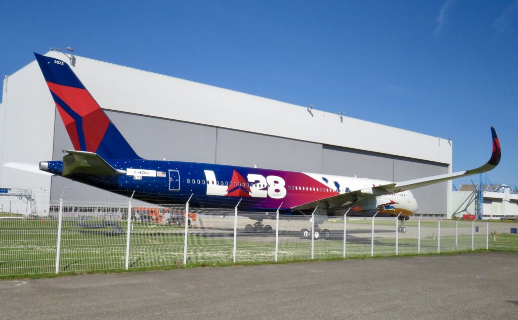 The scheme was spotted outside the paintshop at Toulouse on their new Airbus A350-941 N522DZ (currently wearing test registration F-WZNU).
